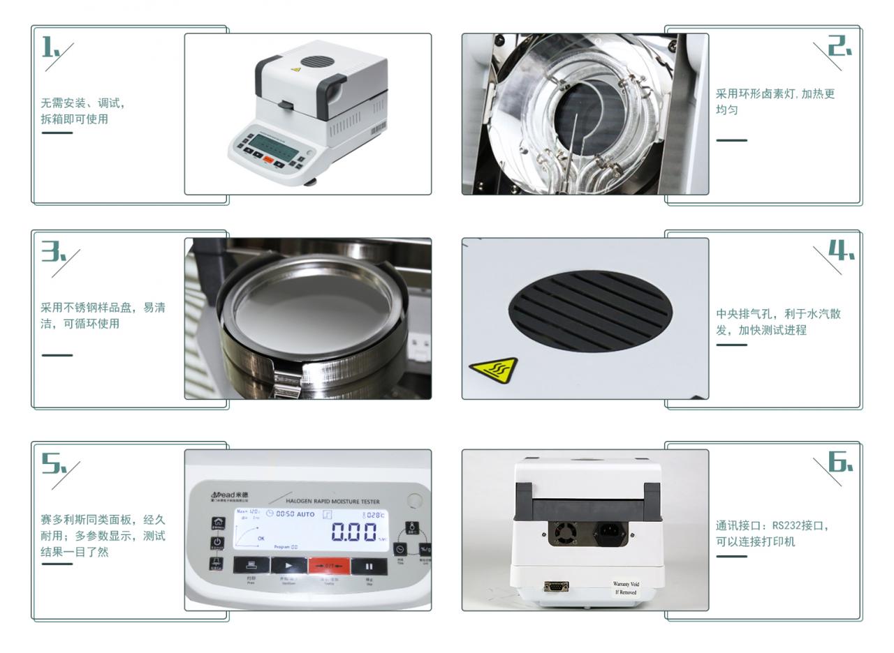 1.代替國標烘箱法,用途非常廣泛、適合各行業的水分測定;
